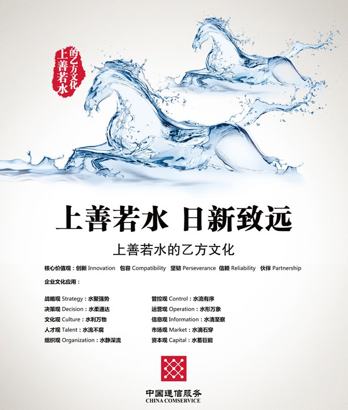 中國通信服務(wù)將水的至善品格融入到公司文化及經(jīng)營發(fā)展當中:以 "重信賴、尚智慧、利萬物" 文化內(nèi)涵和 "創(chuàng)新、包容、堅韌、信賴、伙伴" 的文化品格,在信息化領(lǐng)域中通過打造一體化的總承包服務(wù)能力,向客戶提供綜合信息網(wǎng)絡(luò)建設(shè)解決方案,從而整體實現(xiàn)股東、員工、行業(yè)、客戶和社會的價值,以幫助別人贏得自己成功。