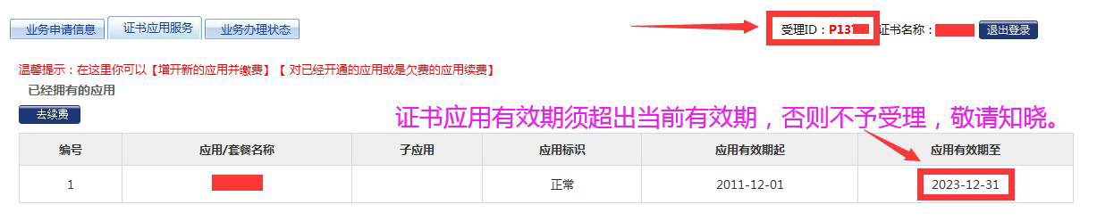 溫馨提醒:證書應(yīng)用有效期內(nèi)方可受理,也就是指證書應(yīng)用有效期須超出當(dāng)前日期,否則不予受理。
