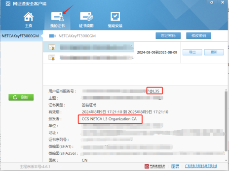打開【網證通安全客戶端】-【我的證書】-【簽名證書】,查看【用戶證書服務號】尾綴,顯示@L35即符合本次免費更換證書業務 。