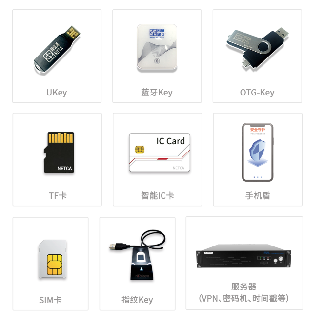 網(wǎng)證通CA的證書介質(zhì)形態(tài)多樣如下圖1所示,可以滿足不同場景的應用。具體如下: