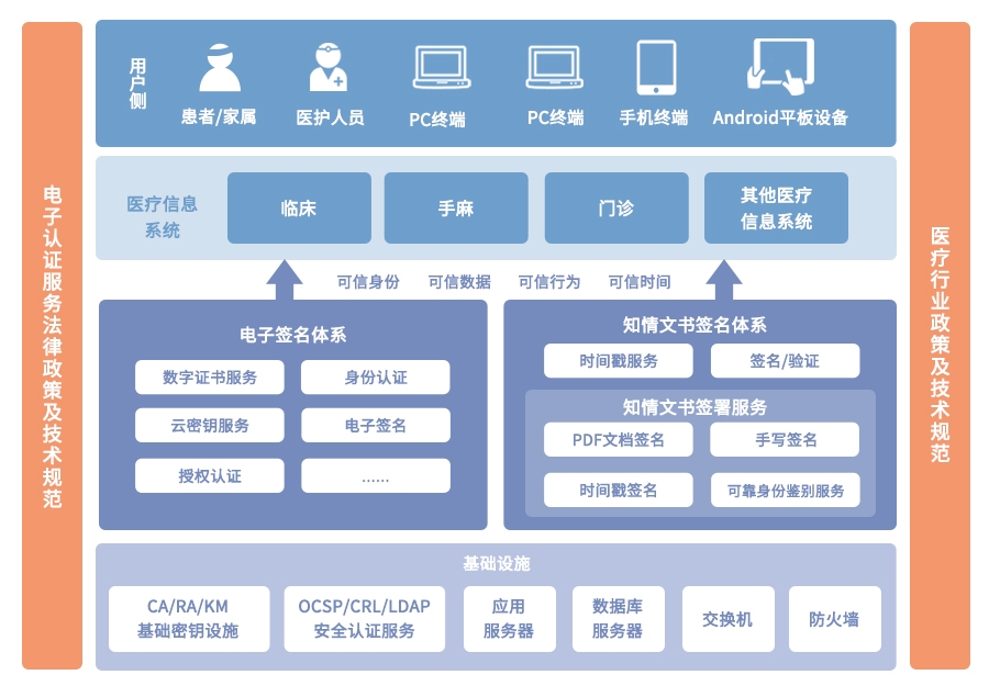 在醫(yī)療服務(wù)中,《知情同意書》是患者表示自愿進行醫(yī)療治療的文件證明,旨在通知患者或患者家屬病情,通過患者或患者家屬在《知情同意書》上進行簽名以示患者同意,使醫(yī)院免于責(zé)任。因此,《知情同意書》無紙化的過程需要獲得醫(yī)患雙方的認可,替代手工簽名的形式必須合理、合法,以保證《知情同意書》具備法律效力,保障患者和醫(yī)院雙方的權(quán)益。由此可見,《知情同意書》簽字的主體除了醫(yī)生之外,還包括廣大的患者及家屬,如何解決《知情同意書》這種特殊應(yīng)用場景下的患者及家屬電子簽名問題,成為了《知情同意書》能否電子化的關(guān)鍵因素,也是醫(yī)院能否真正實現(xiàn)醫(yī)療業(yè)務(wù)無紙化的重要問題。