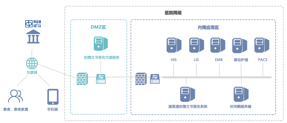 根據(jù)醫(yī)院的網(wǎng)絡(luò)情況,可在DMZ區(qū)部署一套速簽通知情文書簽名代理服務(wù),用于連接在醫(yī)院內(nèi)外的各種醫(yī)療信息系統(tǒng),在內(nèi)網(wǎng)應(yīng)用區(qū)部署速簽通知情文書簽名系統(tǒng)1套,時間戳服務(wù)器1臺。
