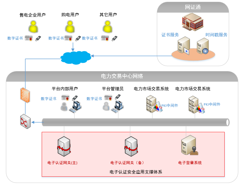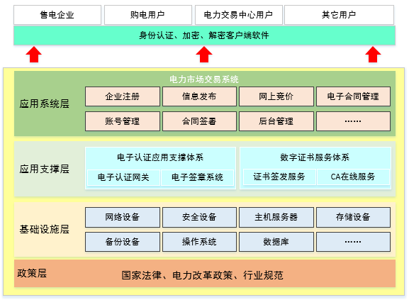 引入合法第三方CA電子認證技術,搭建電子認證支撐平臺,與電力市場交易系統(tǒng)有機結(jié)合,解決電力交易的身份認證安全、數(shù)據(jù)傳輸安全、網(wǎng)上報價保密、網(wǎng)上合同簽署的合法性等安全需求。
